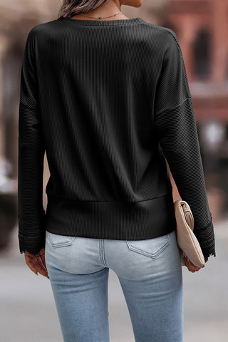 Lace Trim V Neck Long Sleeve Top in Black